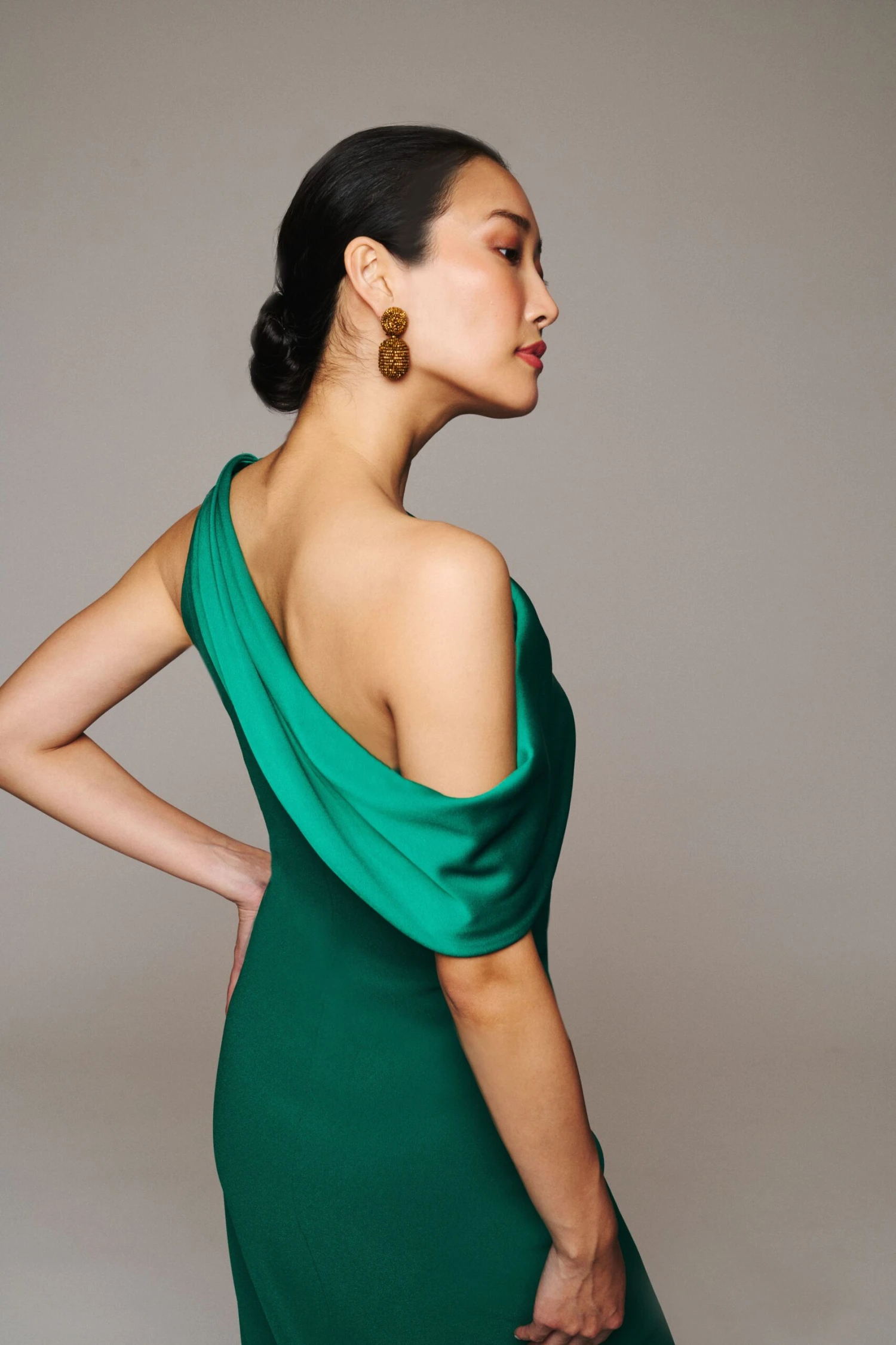 The Angelina Gown in Emerald is a masterclass in modern, sculptural elegance. Cut in a sleek column silhouette, it glides along the body with quiet confidence for a flawless, figure-defining fit. The asymmetrical one-shoulder neckline is artfully draped into a bold, folded overlay, creating striking dimension while showcasing the collarbone with effortless sophistication. Crafted in fluid crepe for a clean, polished finish, Angelina is designed for evenings that call for unforgettable glamour and timeless appeal.