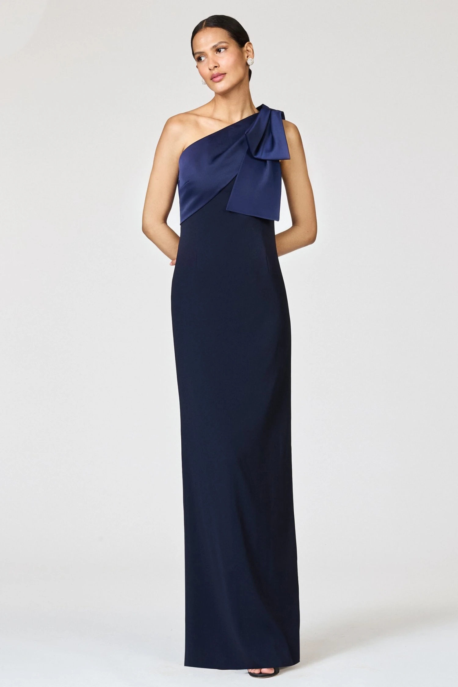 The Estrella Gown in Midnight is a statement of refined evening glamour. Cut from sleek satin crepe in a deep, rich Midnight, it features a modern, sculpted one-shoulder neckline that frames the collarbone beautifully. The column silhouette is clean and elongating, with gentle seaming on either side that accentuates the waist before falling to a graceful floor-length hem. A dramatic oversized bow detail adds a touch of sculptural elegance, making this gown perfect for black-tie events, galas, or any occasion that calls for a show-stopping, sophisticated look.