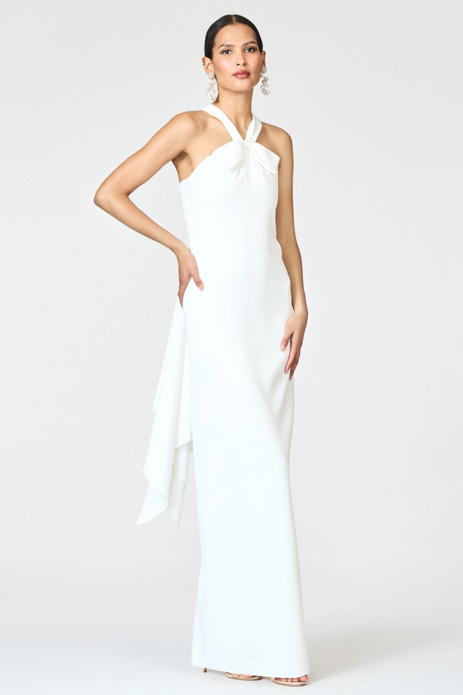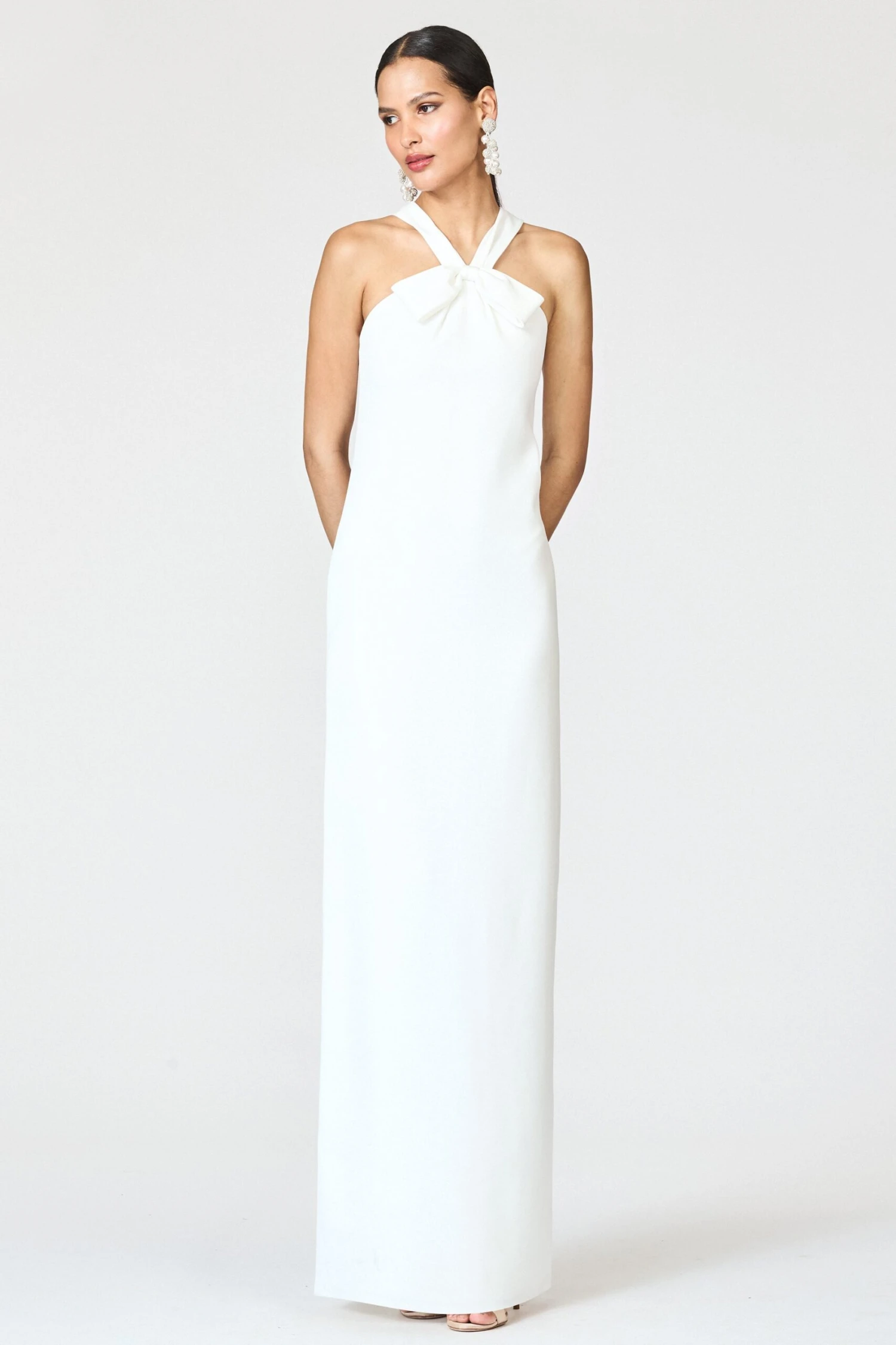 A study in understated drama, the Fern Gown in Ivory is defined by its sculptural halter neckline that forms into an elegant bow at the front. Crafted in a fluid crepe, this floor-length silhouette is tailored to skim the figure with quiet sophistication. At the back, two softly draped streamers descend from the halter straps, creating layered movement and romantic dimension as you walk. A subtle back slit adds ease to the straight skirt. Fern Gown is a modern classic that balances architectural detail with timeless polish.
