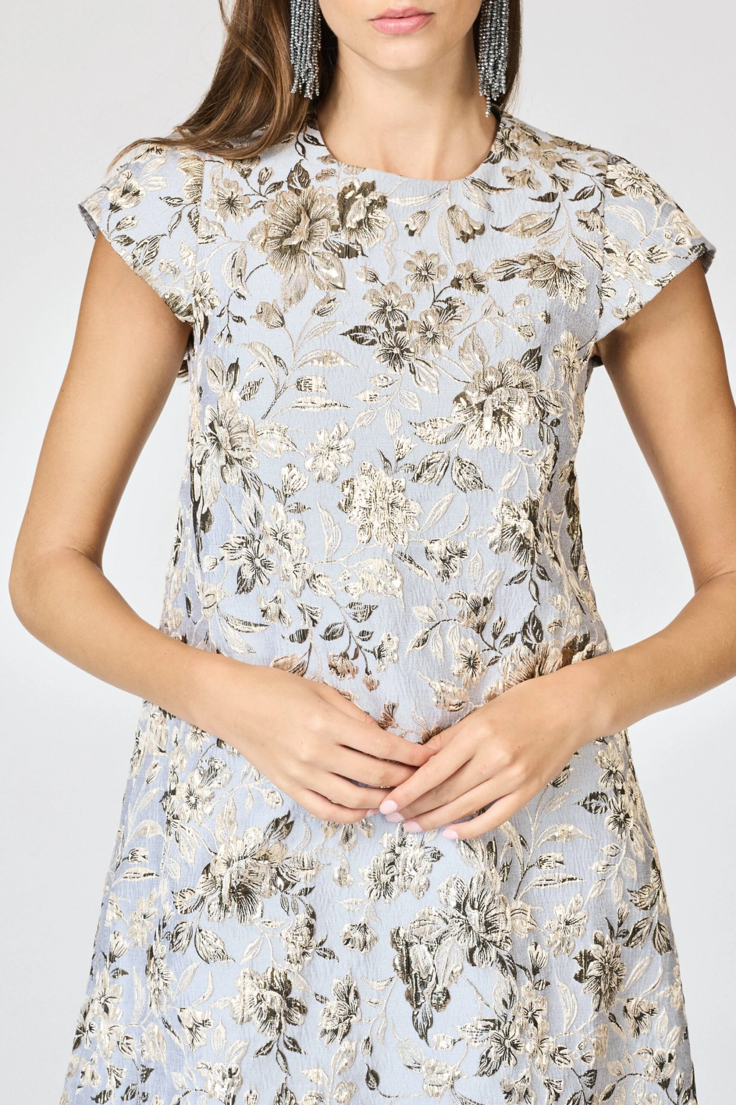The Galina Dress in Golden Gardens is a fresh, modern take on timeless brocade. Crafted in structured jacquard with a luminous floral motif in gold and pewter, it delivers quiet opulence with ease. The clean, sheath mini silhouette features cap sleeves and a high neckline for a polished, tailored look that skims the body with effortless sophistication. Playful yet refined, Galina is designed for celebrations that call for contemporary charm and unmistakable elegance.