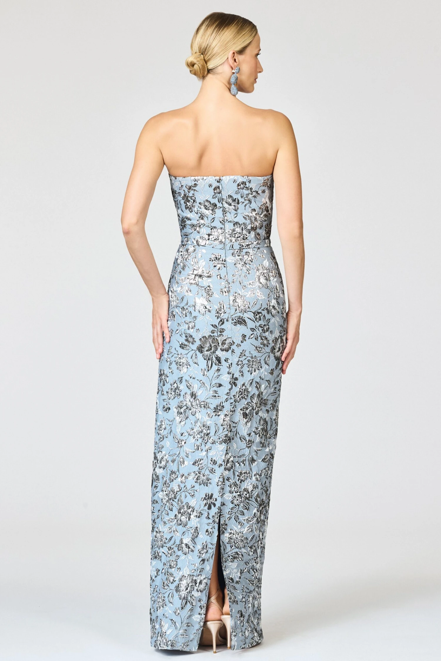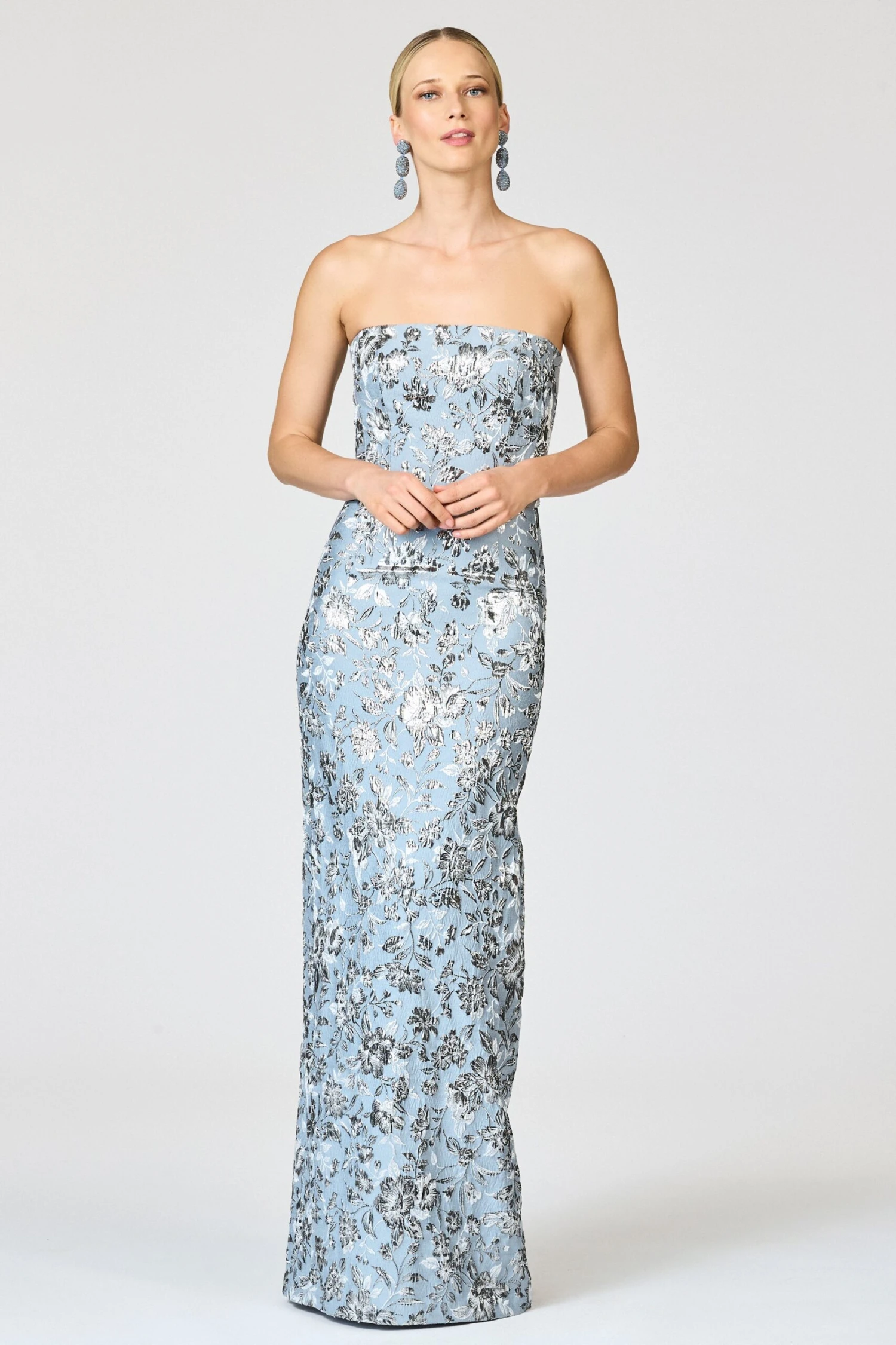 Sophia is a star, a singular gown that knows no rival, only admirers. Crafted from Metallic Cloque, in our exclusive custom Pewter Gardens pattern. This simple style is designed with meticulous care to ensure the most flattering fit. She is a column of quiet luxury.
