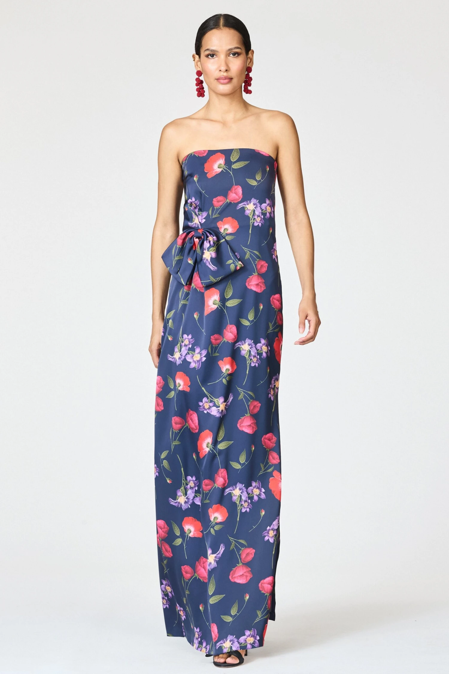 The Monroe Dress is an effortless study in elegance and vibrancy. Crafted in a smooth satin crepe, this strapless column silhouette is reimagined in a painterly Midnight Jardin floral print. A delicately sculpted bow at the waist highlights the figure while adding feminine structure. The side slit offers graceful movement with each step, blending modern ease with statement appeal.
