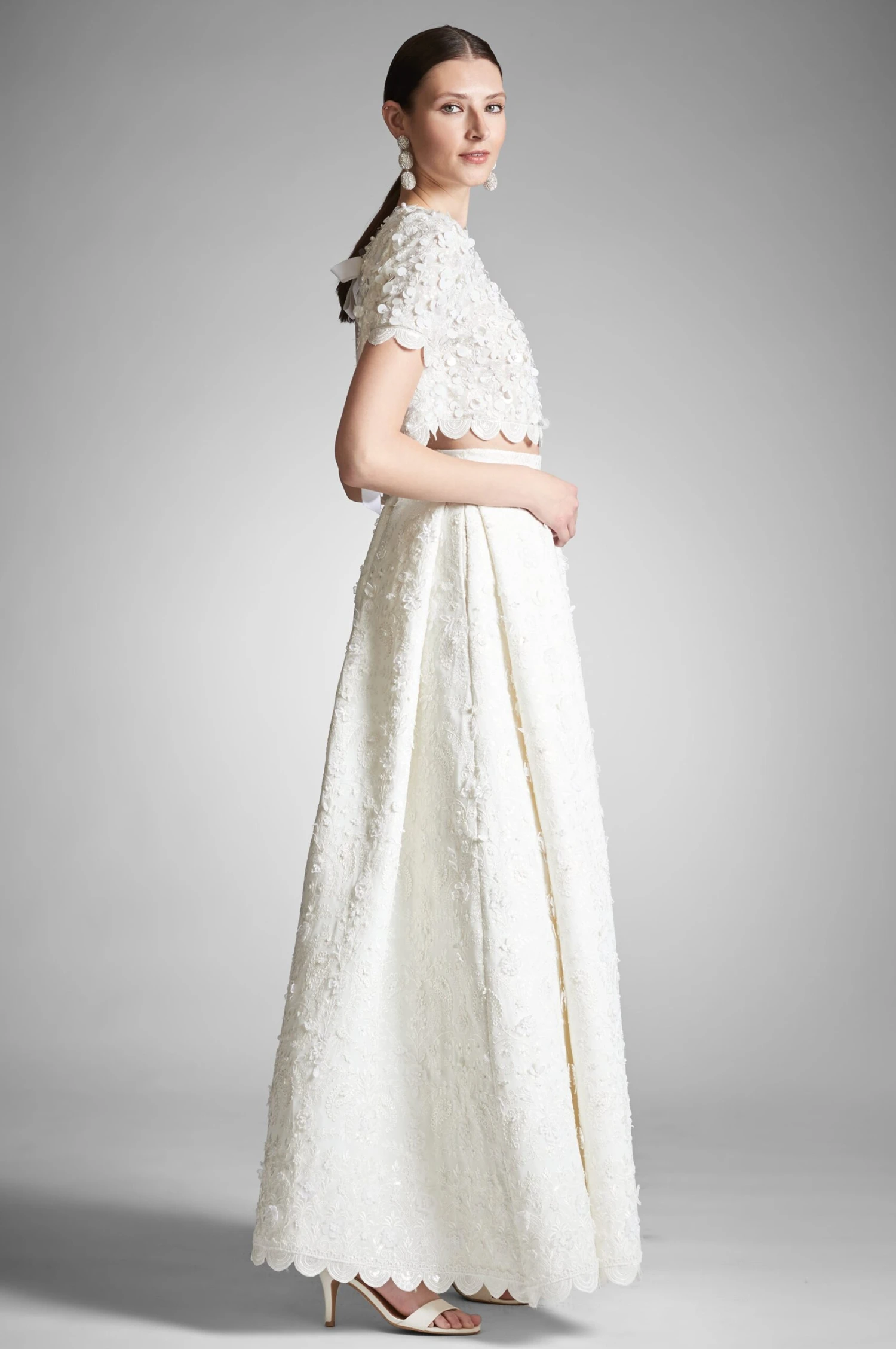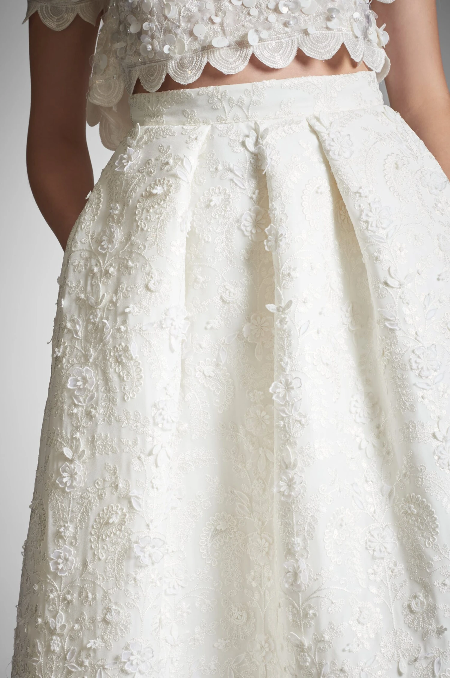 This Pyaar Skirt takes the traditional look of a bride for a stylish spin. Make your special day even more unique with this modern alternative. The two piece set features an embellished, floral applique that is carried throughout the look. The perfect choice for the brides wanting to step away from a traditional bridal gown.