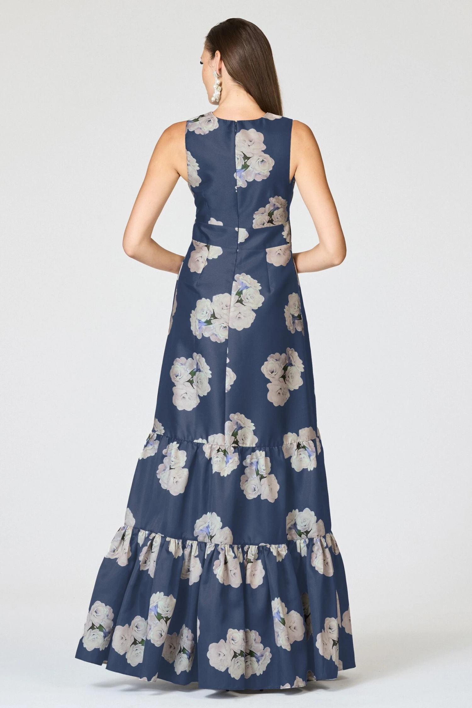 Rori is not for those looking to blend in. She is a show-stopping conversation piece. A clean a-line silhouette with a deep V-neckline is punctuated through tiers of our Steel Blue Corsage print. Featured in our non-stretch Mikado, she is designed to fit and flatter, cinching at the highest point of the waist and elegantly falling at the hip.
