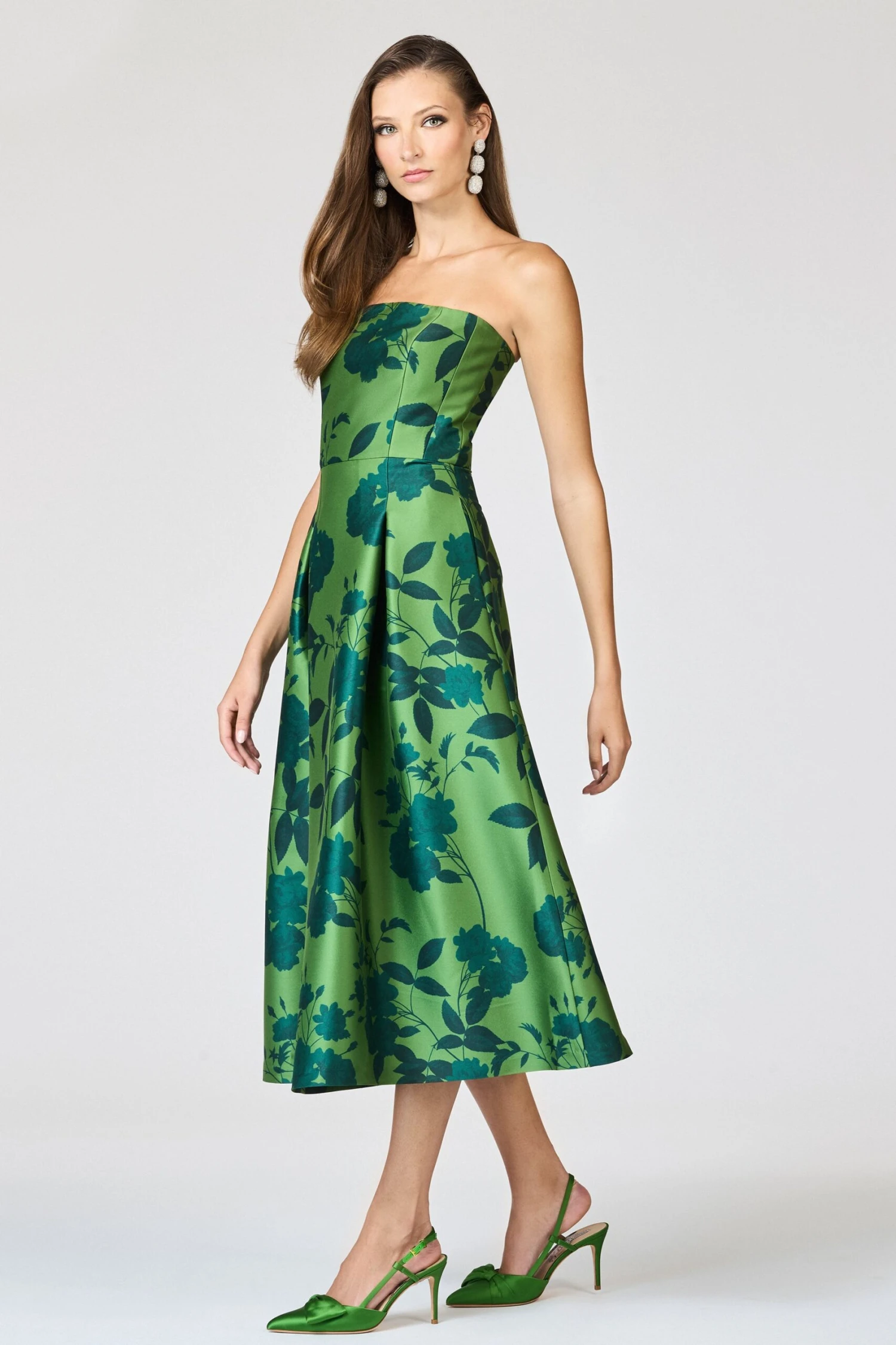 Simply put, Shay is something special. This strapless, tea-length stunner features a fitted bodice that perfectly cascades into an A-line skirt. You’ll find our all-over Empress Green Roses print with a white border amplifies the already elegant silhouette into a true work of art.Â